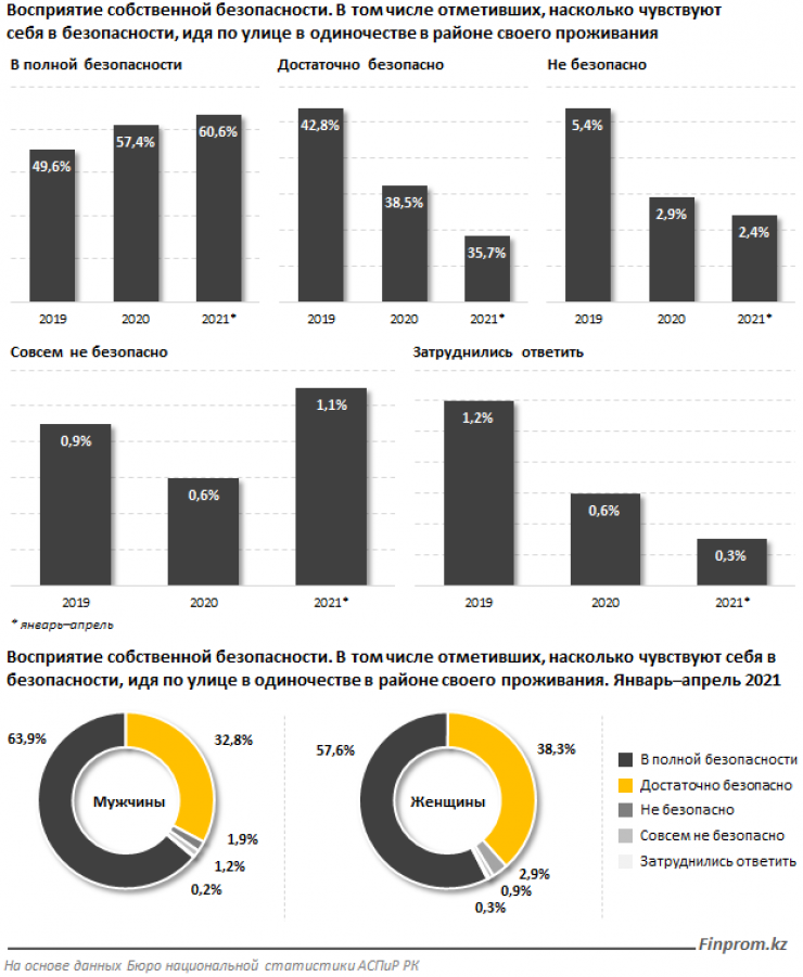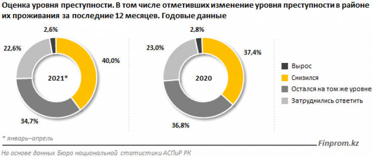 Исследование показало уровень доверия населения к правоохранительным органам, в текущем году в полной безопасности себя ощущали 60,6 процента опрошенных, это больше, чем в прошлом году - 57,4 процента, передает Tengrinews.kz со ссылкой на Finprom.kz.