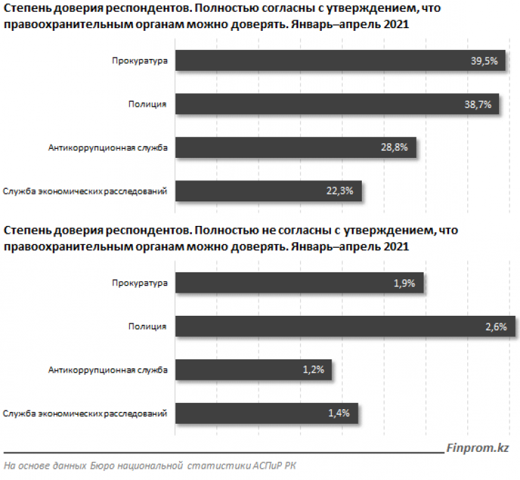 Среди правоохранительных органов наиболее высока степень доверия респондентов к прокуратуре: 39,5 процента опрошенных. Следом идут органы полиции - 38,7 процента и антикоррупционная служба - 28,8 процента. Службе экономических расследований доверяют лишь 22,3 процента опрошенных.