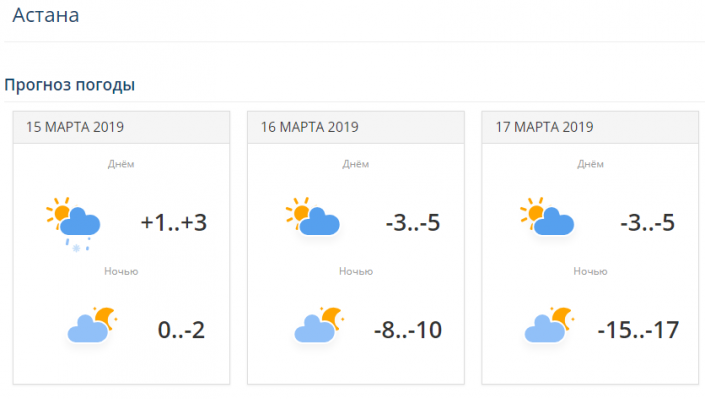 В Астане похолодает уже ночью. 16 марта днем ожидается температура -3...-5, ночью -8...-10. 17 марта ночью температура упадет до -17 градусов. В Алматы температура будет находиться в это время в пределах +15...+18. В Шымкенте ожидается температура +21...+23 градуса тепла.