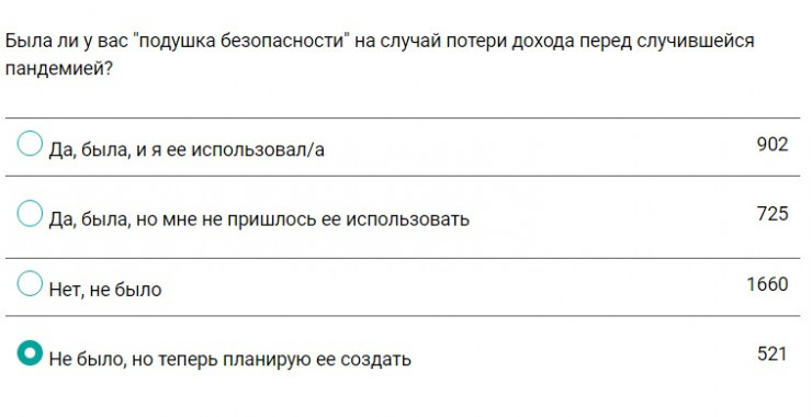 Накопления на случай потери зарплаты перед случившейся пандемией были у 43 процентов опрошенных, при этом 19 процентам не пришлось их использовать. У остальных отложенных денег на черный день не было, но теперь некоторые планируют открыть депозит.