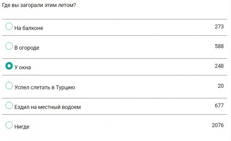 Это лето, бесспорно, можно назвать самым необычным в жизни казахстанцев. Некоторые успели слетать в Турцию (0,5 процента опрошенных), остальные (28 процентов) загорали либо в огороде, либо у себя на балконе и у окна. Кому-то посчастливилось отдохнуть на местных водоемах - 17 процентов. И все же большинство (54 процента) ответили, что нигде не загорали.
