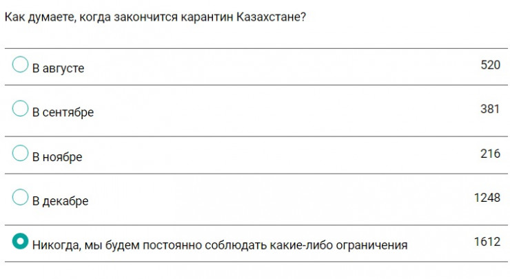 И, пожалуй, самый главный вопрос для казахстанцев - когда окончательно закончится карантин? Ответили на него довольно пессимистично. Сразу 41 процент читателей предположил, что мы постоянно будем соблюдать какие-либо ограничения и карантин не закончится никогда. 31 процент считает, что все закончится в декабре, 13 процентов проголосовали за август, еще 10 процентов - за сентябрь. И всего лишь пять процентов считают, что коронавирус отступит в ноябре.
