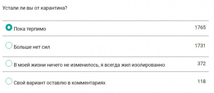 На вопрос "Устали ли вы от карантина?" опрошенные почти поровну разделились между вариантами ответов "Больше нет сил" и "Пока терпимо".