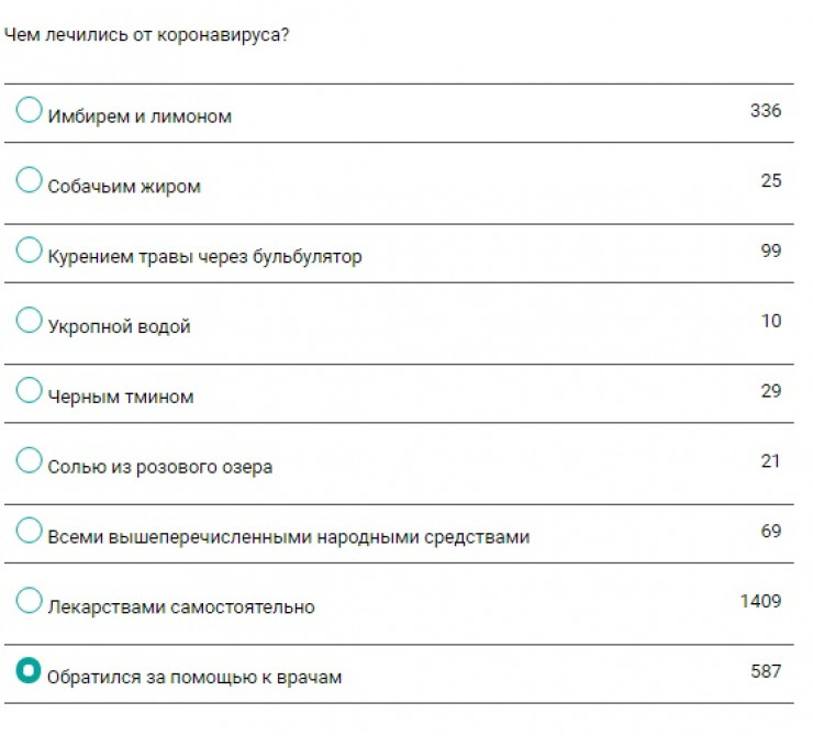 А вот народные средства при лечении коронавируса оказались не очень популярными у опрошенных. Варианты "укропная вода", "собачий жир", "соль из розового озера", "черный тмин" набрали наименьшее количество голосов. Однако востребованными оказались имбирь и лимон - их выбрали 13 процентов. За курение травы через бульбулятор проголосовали четыре процента.