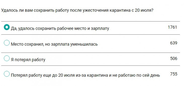 Что касается работы, то многим (48 процентов) удалось сохранить место. У 18 процентов уменьшилась заработная плата. А вот остальные потеряли доход. 20 процентов лишились работы до последнего усиления карантина 20 июля, 14 процентов - после.