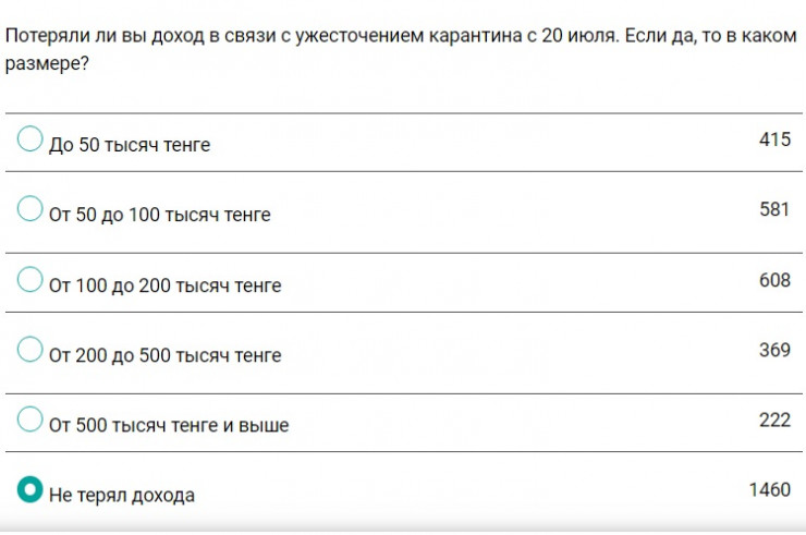 Из-за ужесточения карантина 60 процентов опрошенных лишились дохода. Суммы потерь разнятся от 50 до 500 тысяч тенге в месяц.