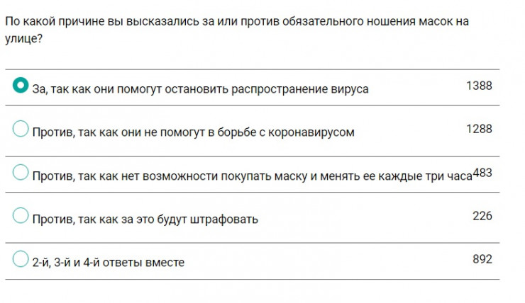 1388 человек высказались "за" ношение масок, так как они помогут остановить распространение вируса. Больше 1000 опрошенных считают, что маски не эффективны в борьбе с коронавирусом. У 483 читателей нет возможности покупать их и менять каждые три часа, еще 226 высказались против них из-за штрафа. Остальные выбрали вариант ответа, в котором озвучены все вышеперечисленные причины против ношения масок на улице.