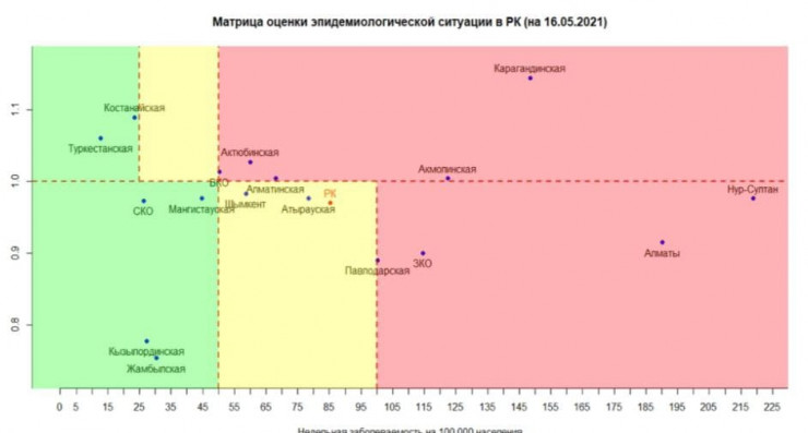 Согласно матрице оценки эпидемиологической ситуации в регионах Казахстана на 16 мая 2021 года в "красной" зоне по темпам распространения коронавируса находятся восемь регионов РК, передает Tengrinews.kz со ссылкой на Telegram-канал МВК по нераспространению COVID-19.