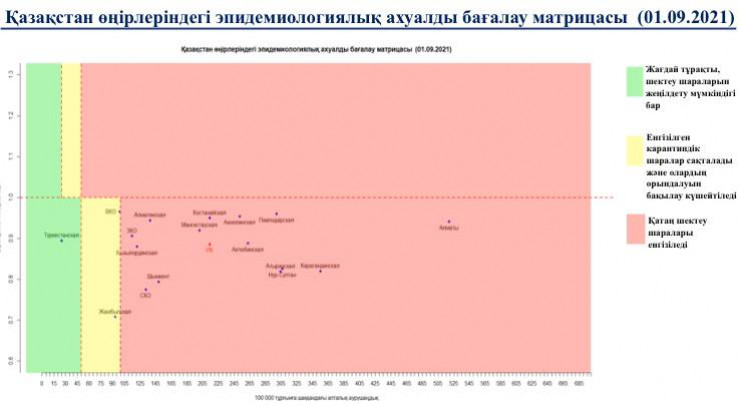 Согласно матрице оценки эпидемиологической ситуации на 1 сентября, в "красной" зоне находятся Нур-Султан, Алматы, Шымкент, Акмолинская, Актюбинская, Алматинская, Атырауская, Западно-Казахстанская, Карагандинская, Костанайская, Кызылординская, Мангистауская, Павлодарская и Северо-Казахстанская области.