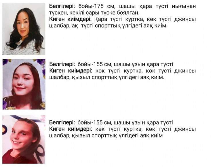 Отмечается, что в настоящее время девочки доставлены в детский дом в Алматы. Продолжаются поисковые мероприятия по установлению местонахождения третьей несовершеннолетней.