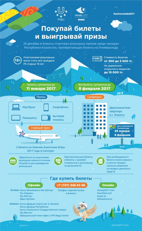 Казахстанцы, купившие билеты на Универсиаду-2017, смогут выиграть двухкомнатную квартиру и другие ценные призы, сообщает корреспондент Tengrinews.kz со ссылкой на Дирекцию по подготовке и проведению 28-й Всемирной Зимней Универсиады 2017.