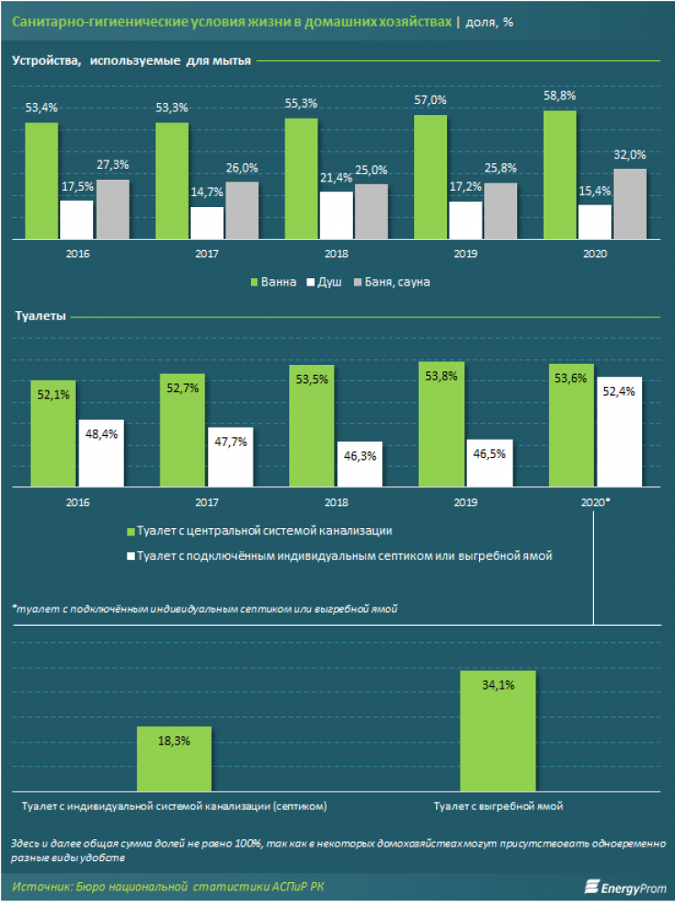 "C туалетами в домохозяйствах наблюдаются проблемы. Так, лишь 53,6 процента обследуемых домохозяйств используют туалеты с центральной системой канализации, 18,3 процента - туалеты с индивидуальной системой канализации (септиком), в то время как 34,1 процента домохозяйств довольствуются туалетами с выгребной ямой", - отмечают аналитики.