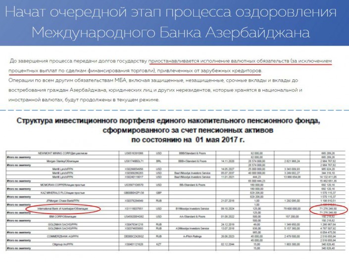 "71,3 миллиарда тенге активов ЕНПФ вложено в облигации ставшего проблемным Международного банка Азербайджана (как следует из отчетности об инвестиционном портфеле ЕНПФ по состоянию на 01 мая 2017 года). По официальной информации, Международный банк Азербайджана приостановил исполнение валютных обязательств, привлеченных от зарубежных кредиторов. Таким образом, могут возникнуть существенные риски сохранности пенсионных активов", - написал Ошакбаев.