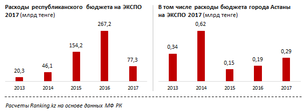 За пять лет подготовки EXPO 2017 в республике выделили 565,1 миллиарда тенге или 2,1 миллиарда долларов, сообщают эксперты Ranking.kz.