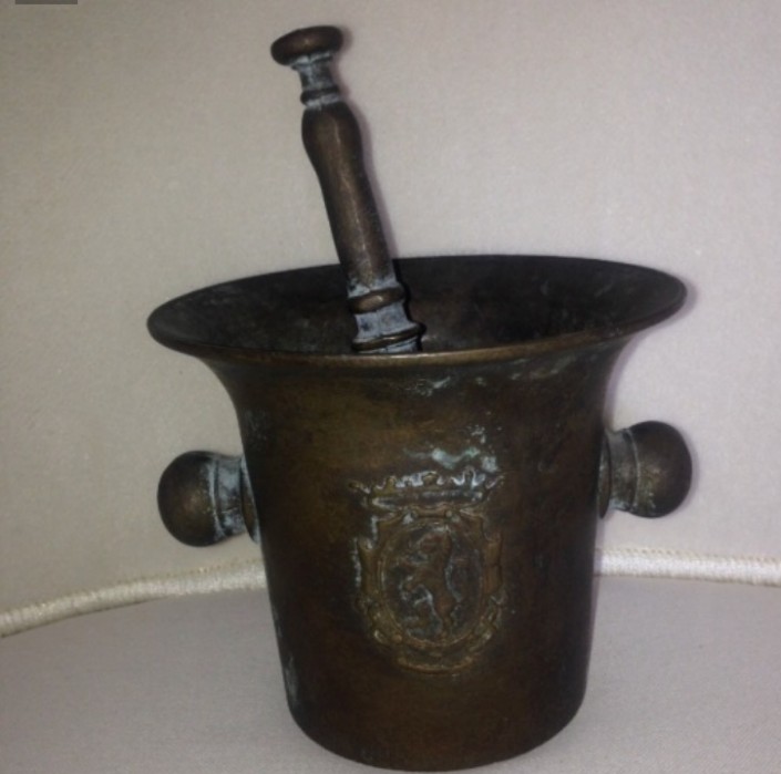 "Бронзовая ступка производства Германии с фамильным гербом. Примерно 1910 год. Высота - 12 сантиметров, верхний диаметр - 14 сантиметров", - описывает товар нынешний владелец.