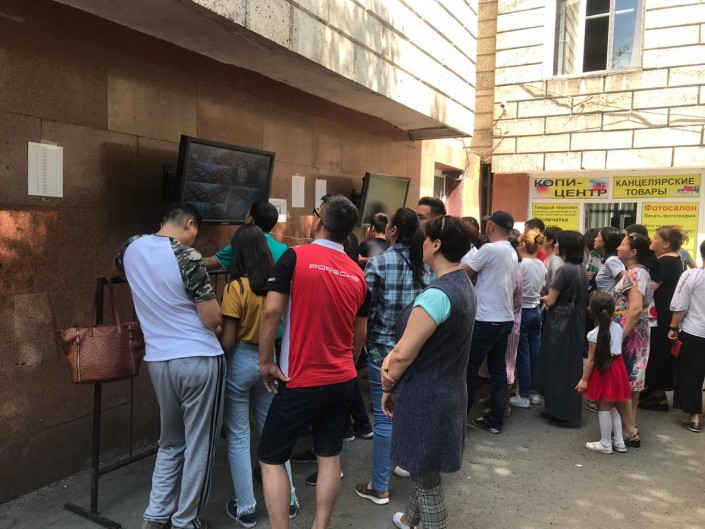 Участникам тестирования дается на решение тестов три часа и 50 минут. Результаты тестирования будут известны уже ближе к вечеру. Вместе с детьми приехали педагоги и родители. Некоторые из них пришли целыми семьями. Одни следили за процессом сдачи экзамена у мониторов, установленных на улице.