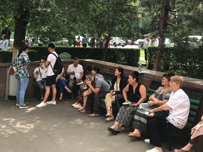 Другие расположились на скамейках и даже на газоне.
