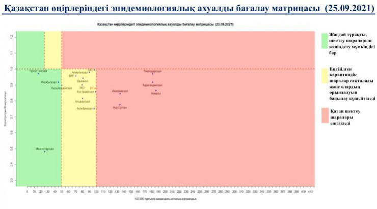 Актюбинская и Костанайская области перешли в "желтую" зону матрицы оценки эпидемиологической ситуации в регионах Казахстана на 25 сентября, передает корреспондент Tengrinews.kz.