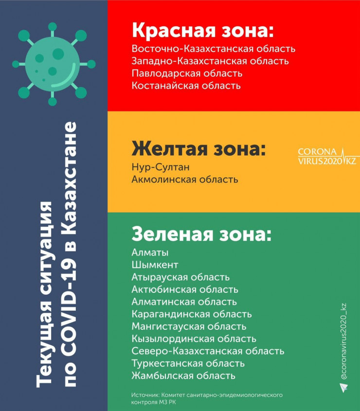 "В "красную" зону у нас входят: Восточно-Казахстанская, Павлодарская, Западно-Казахстанская, Костанайская области. В "желтой" зоне остаются Акмолинская область и Нур-Султан. Все остальные регионы в "зеленой" зоне", - сказал Киясов на онлайн-брифинге СЦК.
