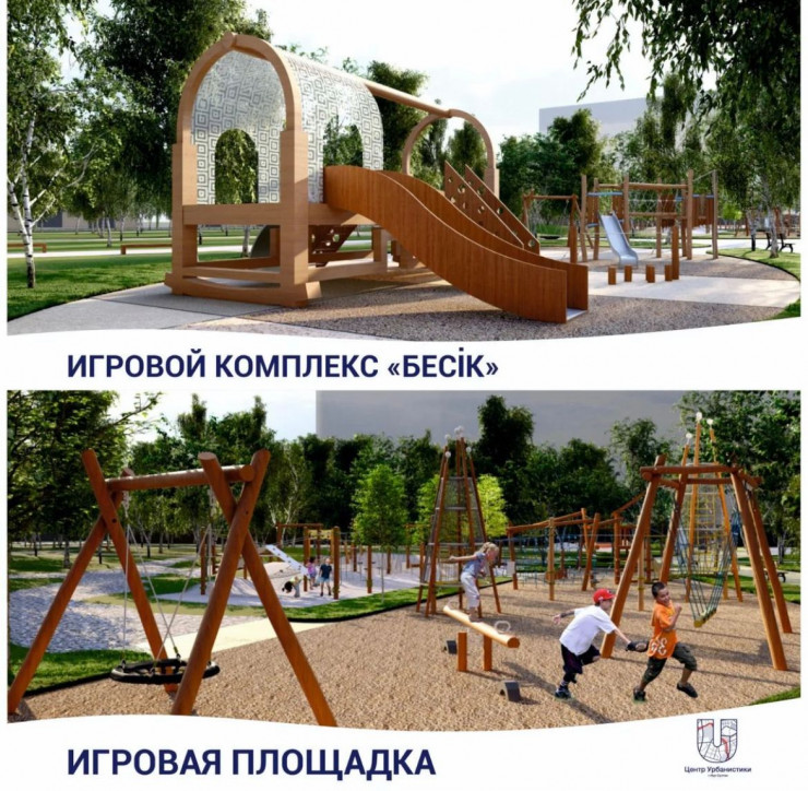 Здесь же планируется озеленение парка лиственными деревьями и многолетними кустарниками. Также будут установлены беседки, качели и гамаки среди деревьев.