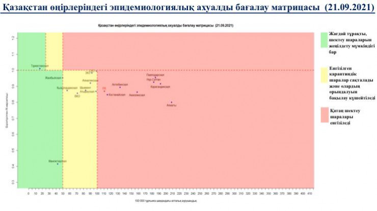 Согласно матрице оценки эпидемиологической ситуации в регионах Казахстана на 21 сентября, в "красной" зоне находятся Нур-Султан, Алматы, Акмолинская, Актюбинская, Карагандинская, Костанайская, Павлодарская области.