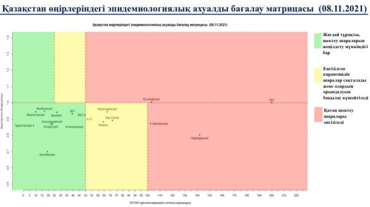 Согласно матрице оценки эпидемиологической ситуации в регионах Казахстана на 8 ноября, в "красной" зоне остаются четыре региона: Костанайская, Павлодарская, Акмолинская, Северо-Казахстанская области.