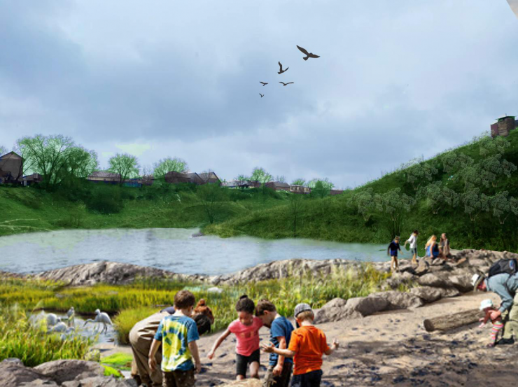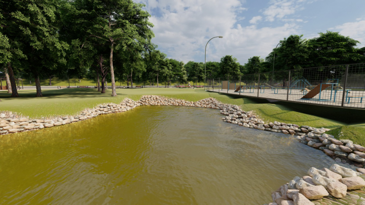 "Здесь предусмотрена установка детских и спортивных площадок, использование природного ландшафта для создания озера. Дополнительное озеленение подчеркнет природный ландшафт и уникальность самого места.