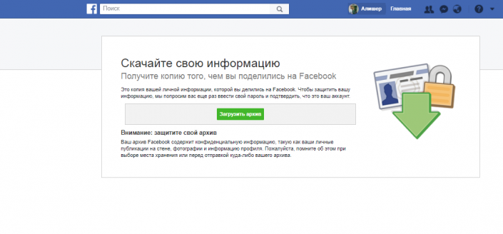 После того как система создаст архив, вам на электронную почту придет оповещение. Перейдя по ссылке, вы сможете скачать Zip-файл с вашими данными с Facebook.
