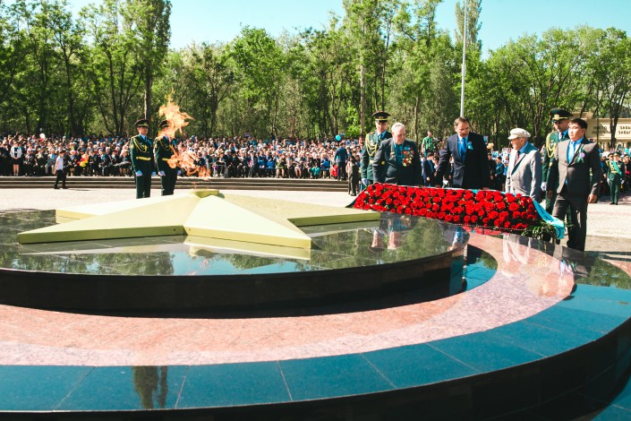 Факел Вечного огня, который был установлен на проспекте Толе би, торжественно перенесли в обновленный парк сегодня утром. В церемонии переноса Вечного огня были задействованы ветераны войны и военнослужащие Регионального командования "Юг". Зажечь пламя было доверенно ветеранам. В это же время по улицам города прошло шествие "Бессмертного полка".