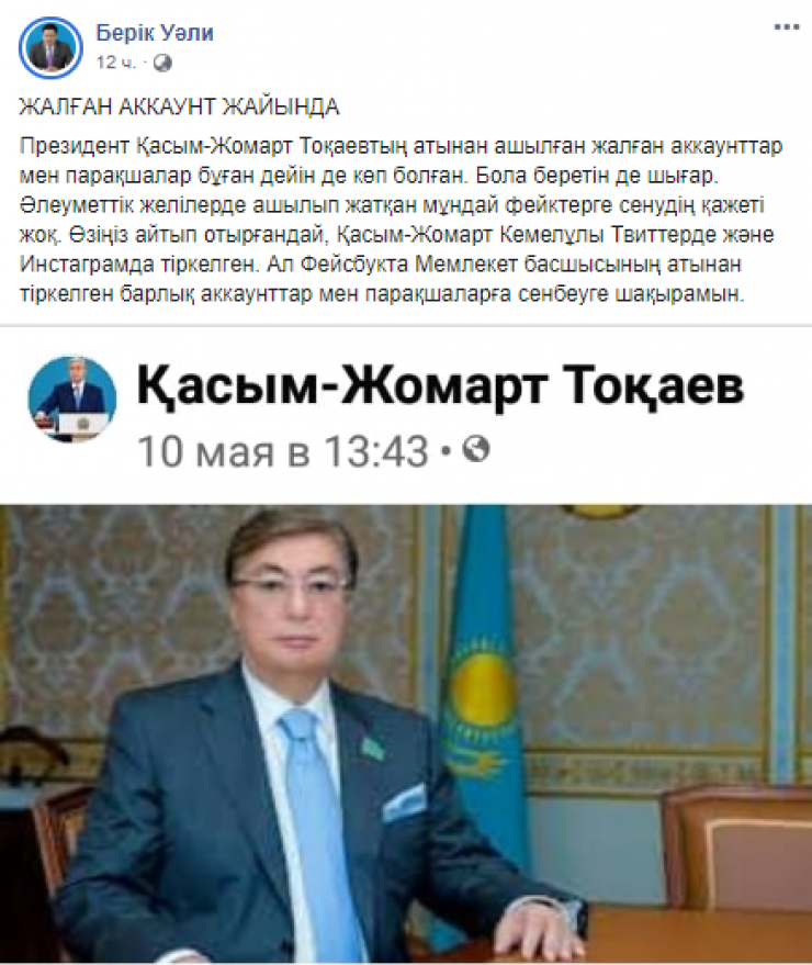 Пресс-секретарь Главы государства Берик Уали прокомментировал, что у Президента нет аккаунта в Facebook, и попросил не доверять ложной информации.