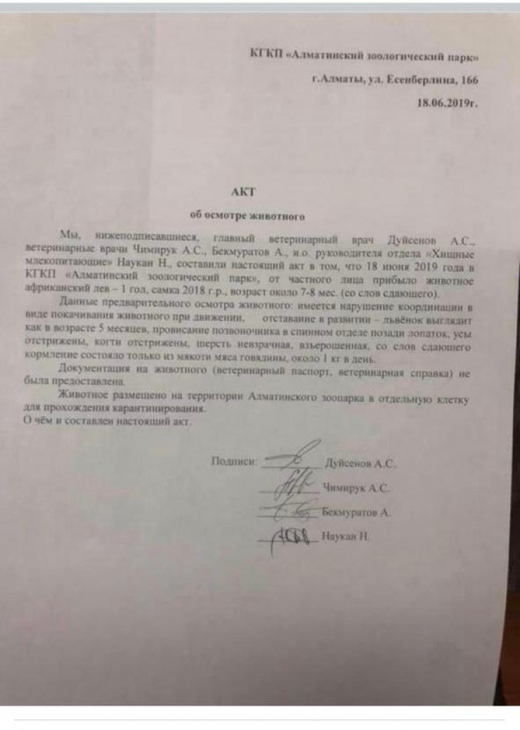 Также автор поста приложил фото мертвого львенка и акт об осмотре животного. В документе было указано, что животное отставало в развитии. Но позже публикация была удалена. У редакции Tengrinews.kz сохранились скриншоты.