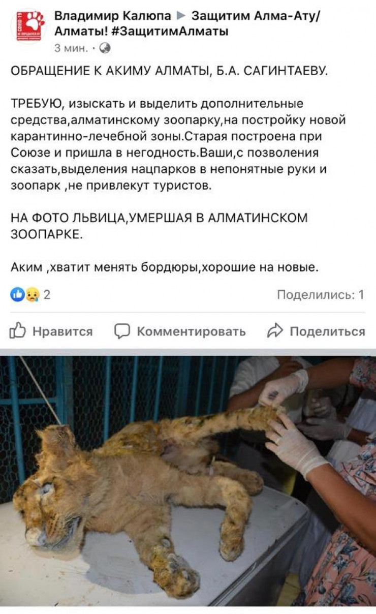 Владимир Калюпа просит обратить внимание на жизнь животных в неволе и выделить средства на постройку новой карантинно-лечебной зоны в зоопарке. Об этом он написал в Facebook-группе "Защитим Алматы".