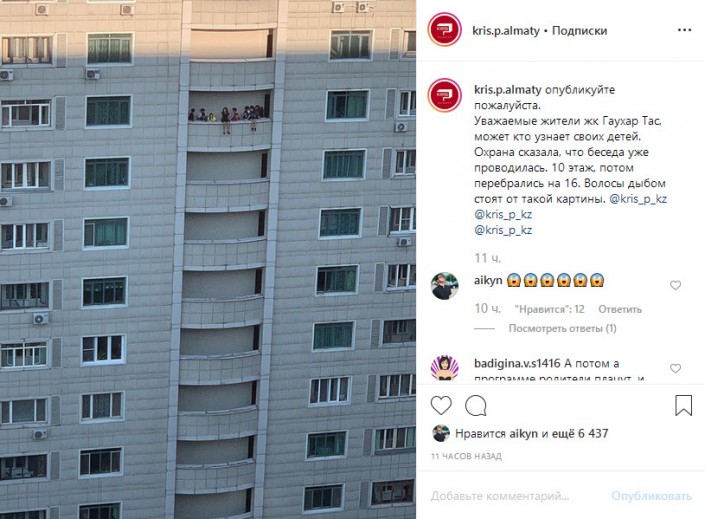 "Уважаемые жители жилого комплекса "Гаухартас", может, кто узнает своих детей. Охрана сказала, что беседа уже проводилась. 10-й этаж, потом перебрались на 16-й. Волосы дыбом стоят от такой картины", - пишет автор снимка.