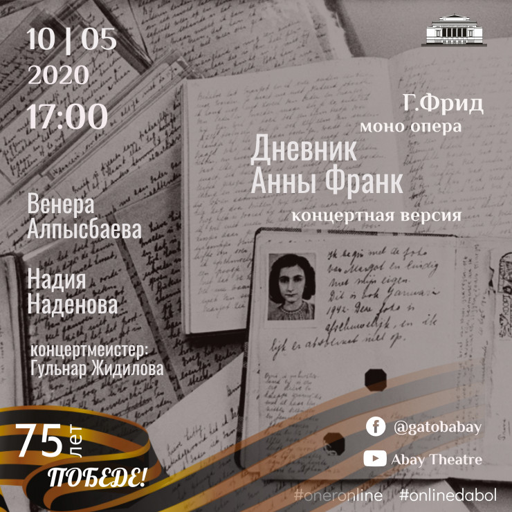 В честь 75-летия со Дня Победы ГАТОБ имени Абая готовил на сцене театра премьеру монооперы Григория Фрида "Дневник Анны Франк", и в данных обстоятельствах концертная версия спектакля состоится 10 мая в 17.00 в онлайн-трансляции Gatob_Life на официальных аккаунтах Facebook (@gatobabay) и Youtube (Abay Theatre). Опера приурочена ко Дню памяти и скорби и впервые пройдет в режиме онлайн.