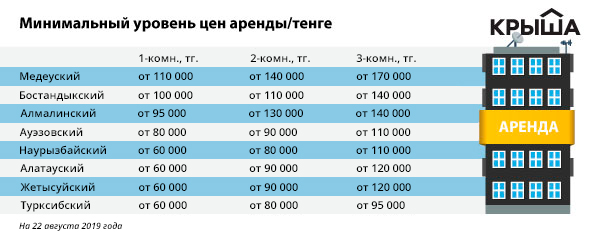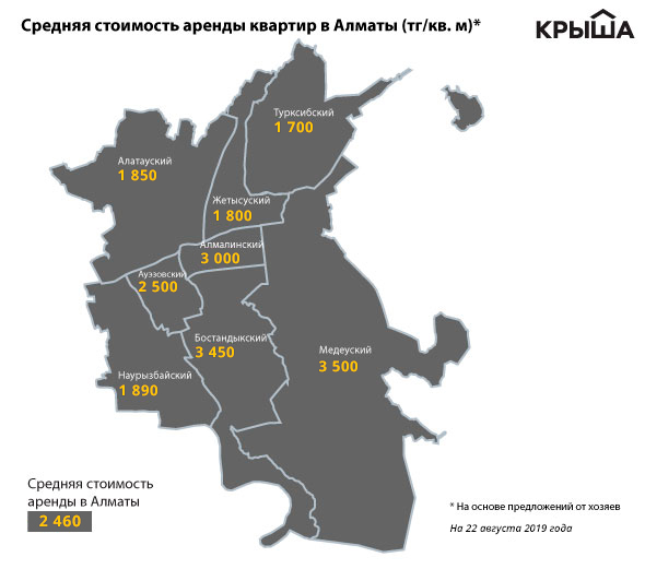 Мониторинг рынка показал, что на 22 августа 2019 года 1 квадратный метр жилья в Алматы сдается в среднем по 2 460 тенге (учитывались 1-, 2-, 3-комнатные квартиры от владельцев, исключая общежития).
