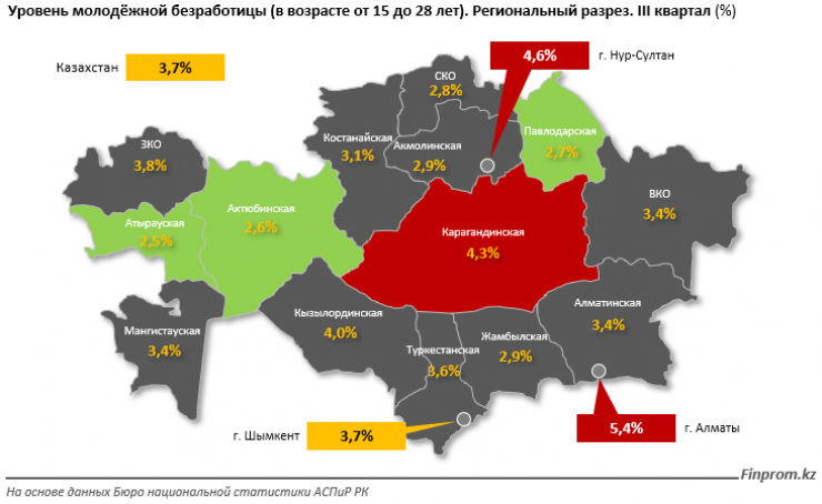 Среди регионов Казахстана самый высокий уровень молодежной безработицы отмечен в Алматы (5,4 процента), следом идут Нур-Султан (4,6 процента) и Карагандинская область (4,3 процента). Наименьший уровень безработицы среди молодежи наблюдается в Атырауской, Актюбинской и Павлодарской областях.