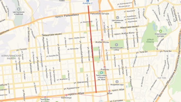 По улице Казыбек би от улицы Кунаева до улицы Зенкова.