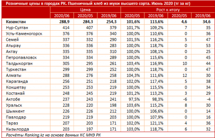 Среди крупных городов и мегаполисов пшеничный хлеб из муки первого сорта дороже всего обходился жителям Атырау (178 тенге за килограмм) и Актау (173 тенге за килограмм). Дешевле всего такой хлеб стоил в Алматы (132 тенге за килограмм) и Таразе (138 тенге за килограмм).