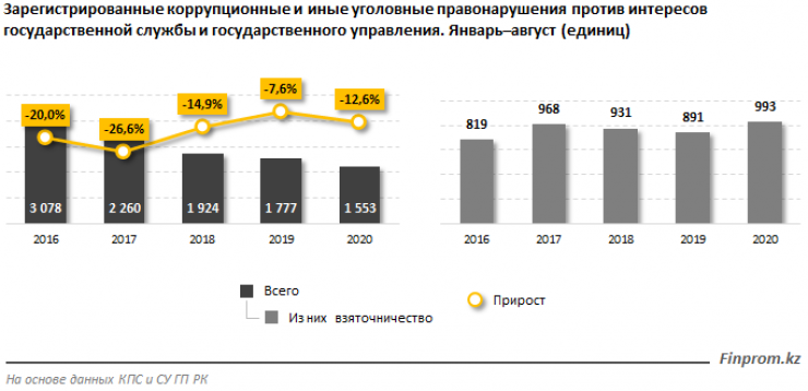 Аналитики подсчитали, что за январь - август 2020 года в стране зарегистрировали 1,6 тысячи коррупционных и иных уголовных правонарушений против интересов государственной службы и государственного управления, это на 12,6 процента меньше, чем годом ранее.