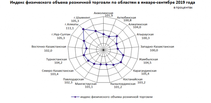 По данным ведомства, наибольший удельный вес в общем объеме розничной торговли республики в январе-сентябре 2019 года приходится на Алматы - 31,2 процента, Нур-Султан - 12 процентов, Карагандинскую область - 9 процентов, Восточно-Казахстанскую область - 8,8 процента.