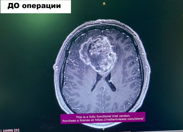 Мужчина жаловался на головные боли, головокружение, снижение зрения, снижение памяти, слабость в левых конечностях, а также на судорожные приступы. Пациенту был поставлен диагноз "гигантская глиальная опухоль правой лобной доли с прорастанием в мозолистое тело в стадии клинической декомпенсации". Размер опухоли составил семь на семь сантиметров.
