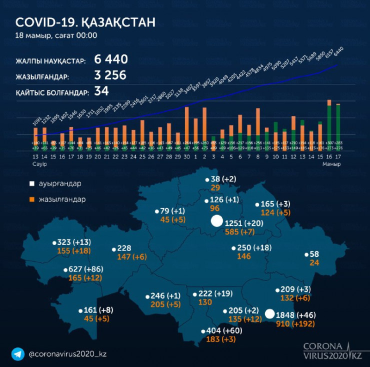 В настоящее время по области насчитывается 222 человека с коронавирусной инфекцией. Всего в стране выявлено 6440 заболевших, число выздоровевших пациентов увеличилось до 3256 человек. Летальных случаев - 34.