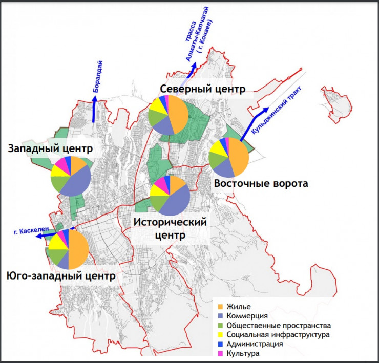 "Для устранения дисбаланса в развитии Алматы необходимо все районы привести к одному уровню качества жизни по принципу полицентричности. Для его развития будут развиваться пять новых центров: Западный, Северный, Юго-западный, Восточные ворота и Исторический центр.