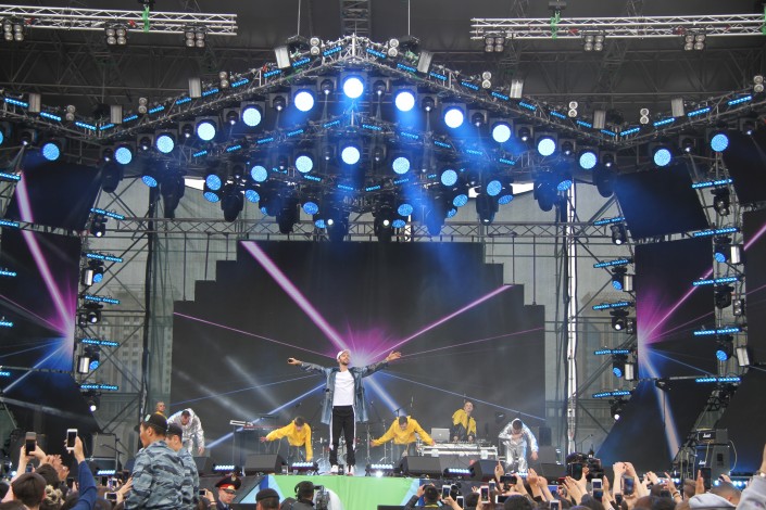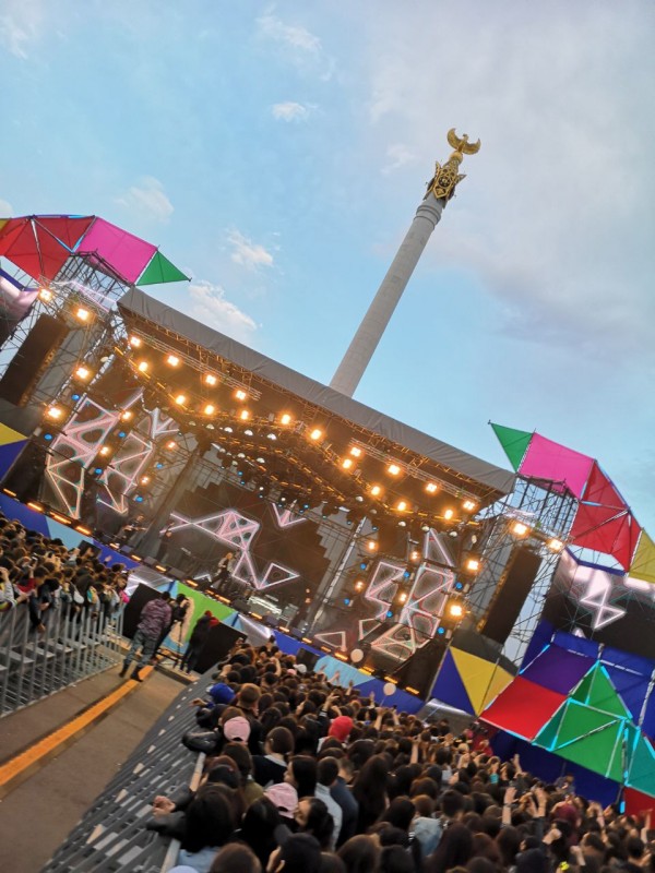 Несмотря на ветер и прохладную погоду, уже ставшую привычной для Астаны, на площади "горячо". Хит за хитом звучат со сцены в казахстанской столице. Многотысячную аудиторию под "Туманы" "раскачали" Макс Барских, украинская и российская поп-группа Artik & Asti - под песни "Номер 1" и "Неделимы". Горячо аудитория встретила рэпера Натана, Рината Малцагова, Анну Седокову, Джигана и группу "Градусы".