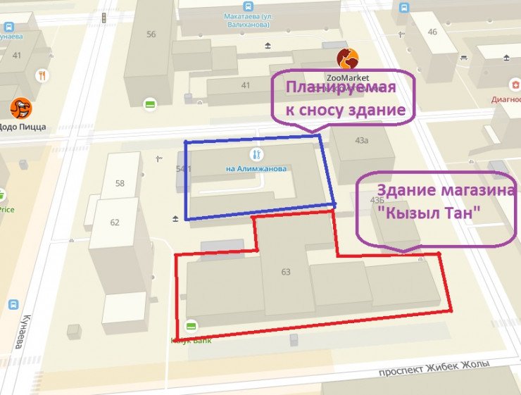 "Участок находится в общественно-деловой зоне, то есть на территории системы общегородского центра и в зоне отчуждения метрополитена. В 2017 году выдано архитектурно-планировочное задание на строительство административного здания с подземным паркингом со сносом существующего строения. Эскизный проект согласован в 2019 году. Важно отметить, что строительство не касается знаменитого здания магазина тканей "Кызыл Тан". А здание, подлежащее сносу, не входит в реестр памятников архитектуры Алматы", - сказали в управлении.