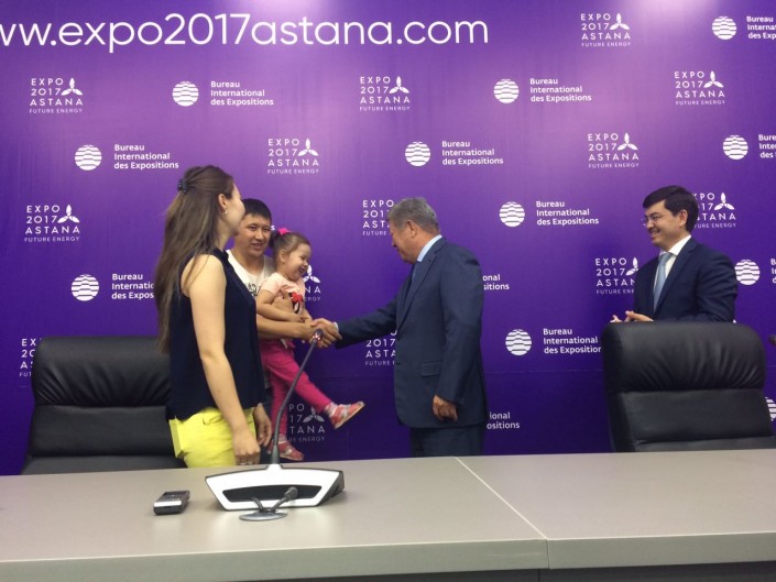 Глава нацкомпании вручил миллионному посетителю несколько многоразовых абонементов на EXPO-2017, которые позволят ей посещать выставку неограниченное количество раз, планшет, портативное зарядное устройство и сувениры на память. Трехлетняя дочь Гульжихан получила в подарок игрушечного маскота EXPO-2017.