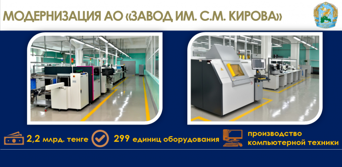 Завод имени Кирова и ПЗТМ обновляют оборудование. На заводе Кирова годовой объем продукции достиг показателей в 10,7 миллиарда тенге. Завод налаживает выпуск компьютерной техники. ПЗТМ начал собирать термовагоны, мощность составит 1200 вагонов в год.