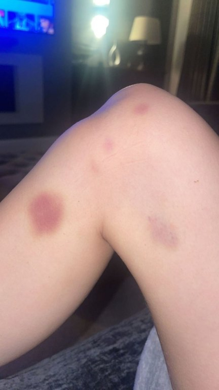 Девушка опубликовала фотографии в Instagram Stories, на которых запечатлены кровоподтеки на ее лице и синяки на руках и ногах.