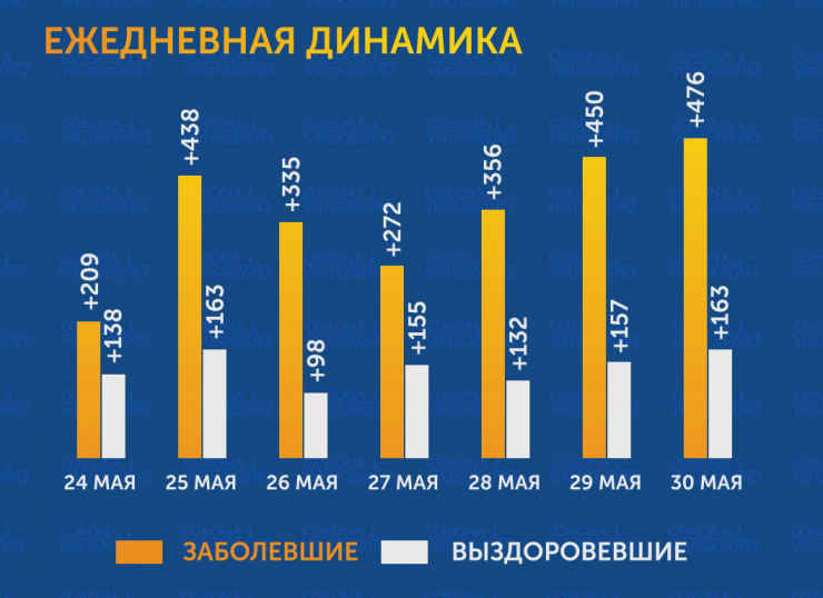 Темп прироста заболевших 30 мая за сутки по всей стране составил 4,6 процента. За прошедшие сутки в трех регионах Казахстана не нашли новых больных коронавирусом