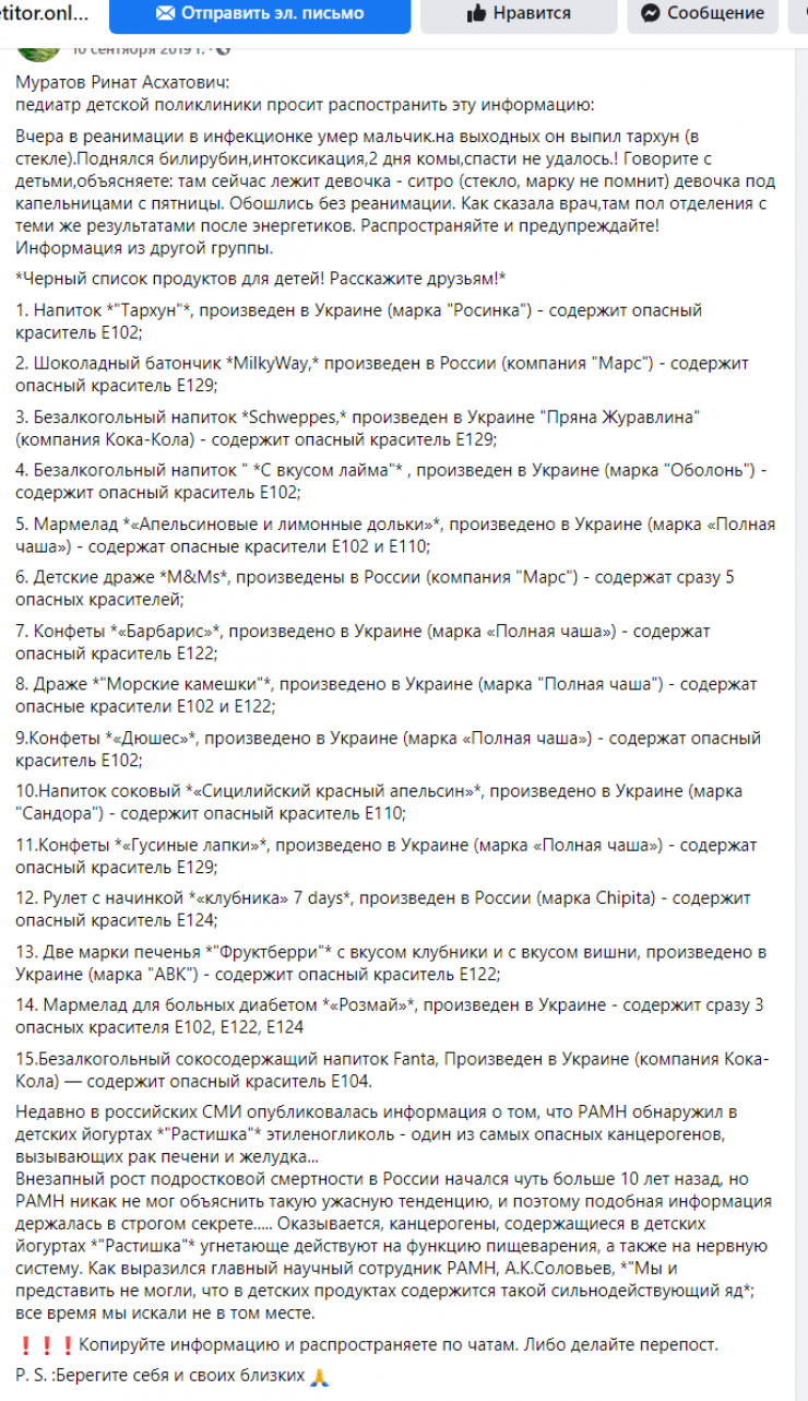 Пользователи Казнета распространяют сообщение от имени некого педиатра Рината Муратова. В рассылке говорится, что в одной из казахстанских больниц скончался ребенок, после того как выпил напиток "Тархун", еще один ребенок находится в реанимации, передает Tengrinews.kz со ссылкой на Stopfake.kz.